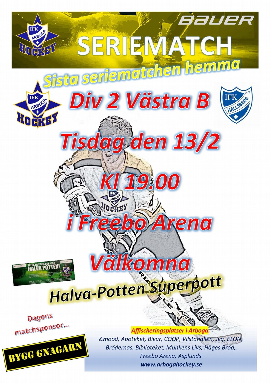 På tisdag spelar A-laget sin sista seriematch hemma för säsongen.IFK Hallsberg står för motståndet.Hjärtligt välkomnaPlayoff 1 börjar borta onsdag den 21/2 och första hemmamatchen på lördag den 24/2 eventuellt hemmamatch söndag den 25/2