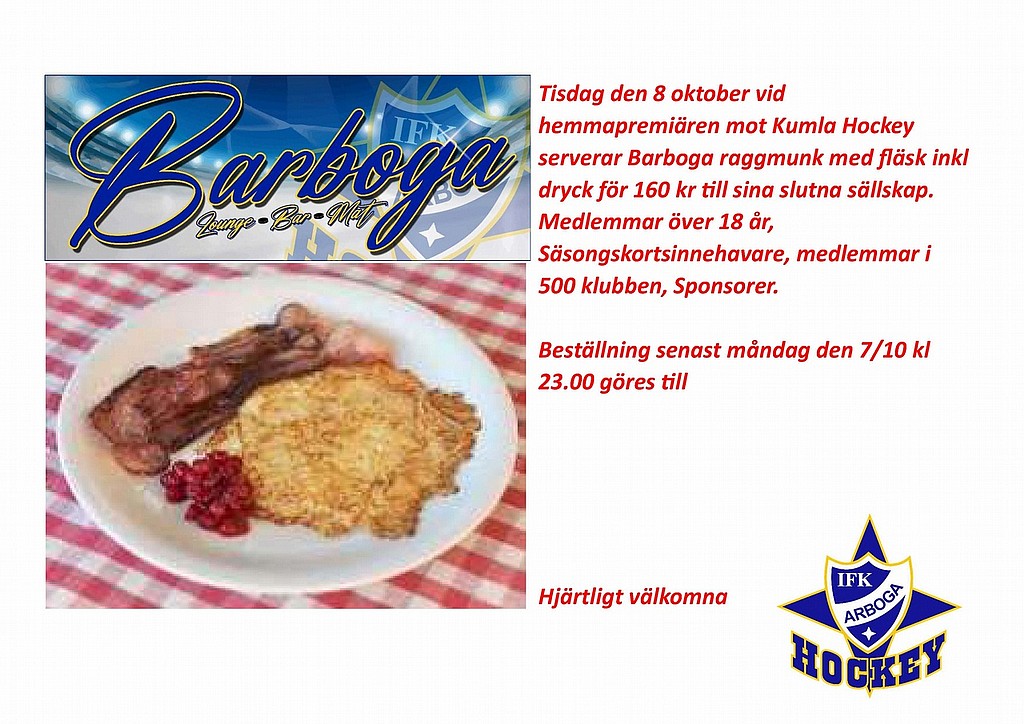 Raggmunk & Fläsk inkl dryck för 160 kr serveras vid Kumla matchen