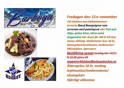 Tillhör du våra slutna sällskap kan Barboga erbjuda två maträtter.Förbokning sker till supporterklubben@arbogahockey.se Senast torsdag kl 15.00Välkomna!