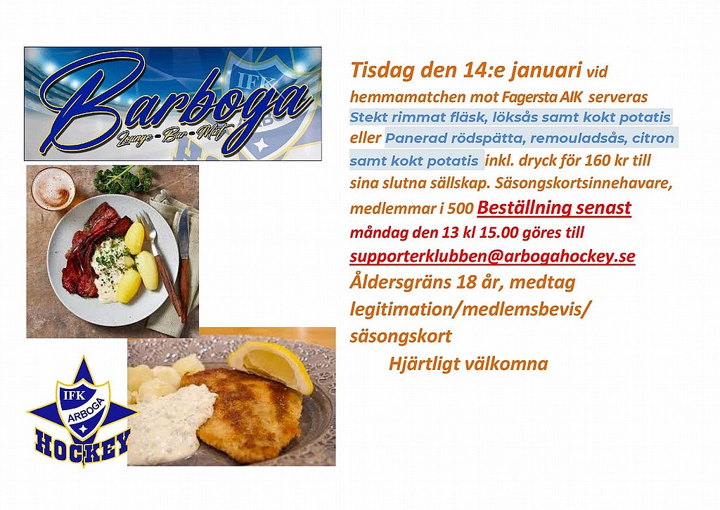 Förbeställning senast i morgon den 13/1 kl 15.00 tillsupporterklubben@arbogahockey.se Gäller endast våra slutna sällskapÅldersgräns 18 år.Välkomna